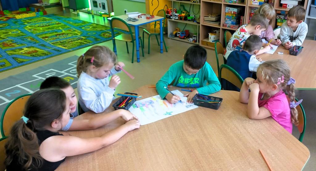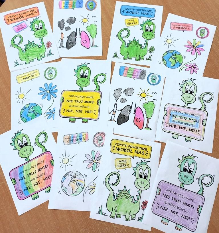 W pierwszym półroczu grupa Żabki przy współudziale Powiatowej Stacji Sanitarno-Epidemiologicznej realizowała zadania w ramach programu przedszkolnej edukacji antytytoniowej"Czyste powietrze wokół nas".Celem cyklu pięciu zajęć było:rozwijanie umiejętności określania różnych źródeł dymów,umiejętności określania przyczyn wydobywania się tych dymów,uwrażliwienie na szkodliwość dymu papierosowego,uświadomienie dzieciom skutków palenia papierosów,uwrażliwienie dzieci na miejsca, w których mogą być narażone na dym i unikanie dymu papierosowego.Przedszkolaki poznały postać Dinusia,który prowadził je przez zagadnienia związane z tematem.Dzieci bardzo chętnie uczestniczyły w zajęciach,które skoncentrowane były na pobudzaniu różnych form aktywności dziecka poprzez zabawy twórcze,tematyczne,grupowe i konstrukcyjne.Na zajęciach dzieci wykonywały odpowiednie rysunki,których celem było uświadomienie szkodliwości dymu papierosowego.Dzieci wykonywały ćwiczenia oddechowe i relaksacyjne przy muzyce,uświadamiając sobie,że oddychanie świeżym powietrzem jest zdrowe.W formie pantomimy naśladowały zachowanie osób niepalących i palących.Projektowały własne znaczki z hasłem”Nie pal przy mnie".Podsumowaniem zajęć było wykonanie tematycznych kolorowanek z Dinusiem w tle.