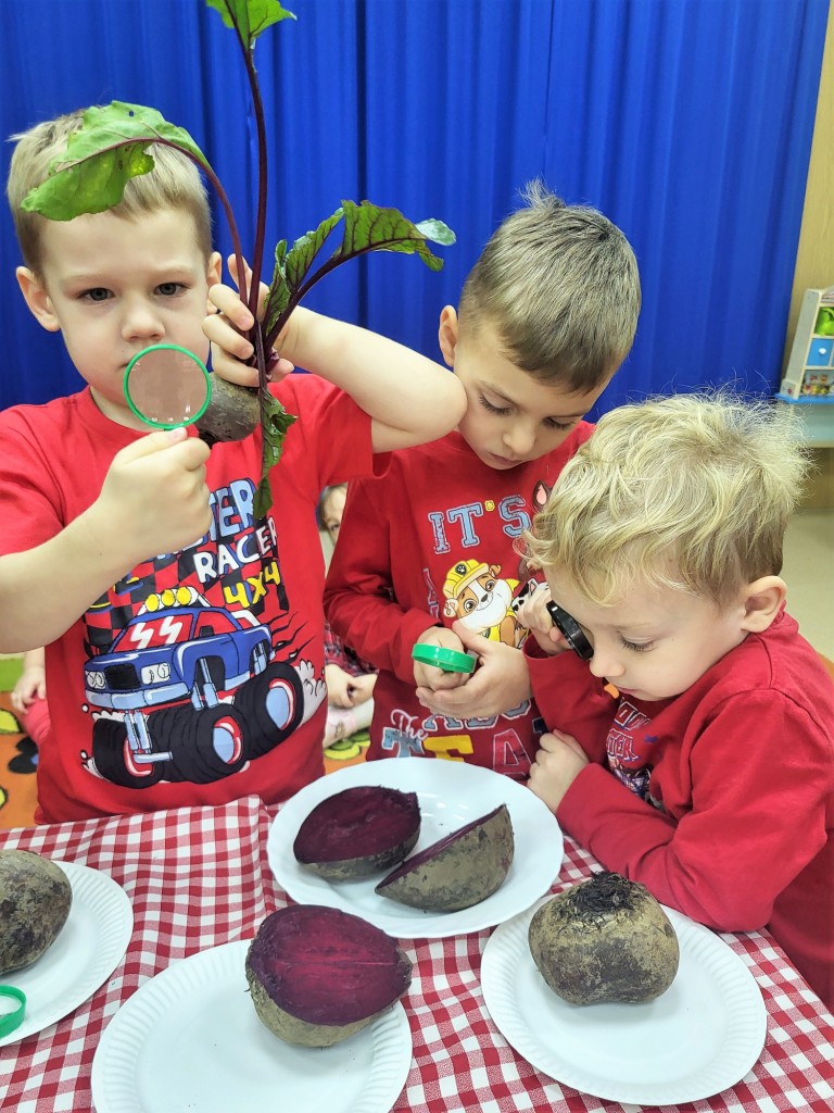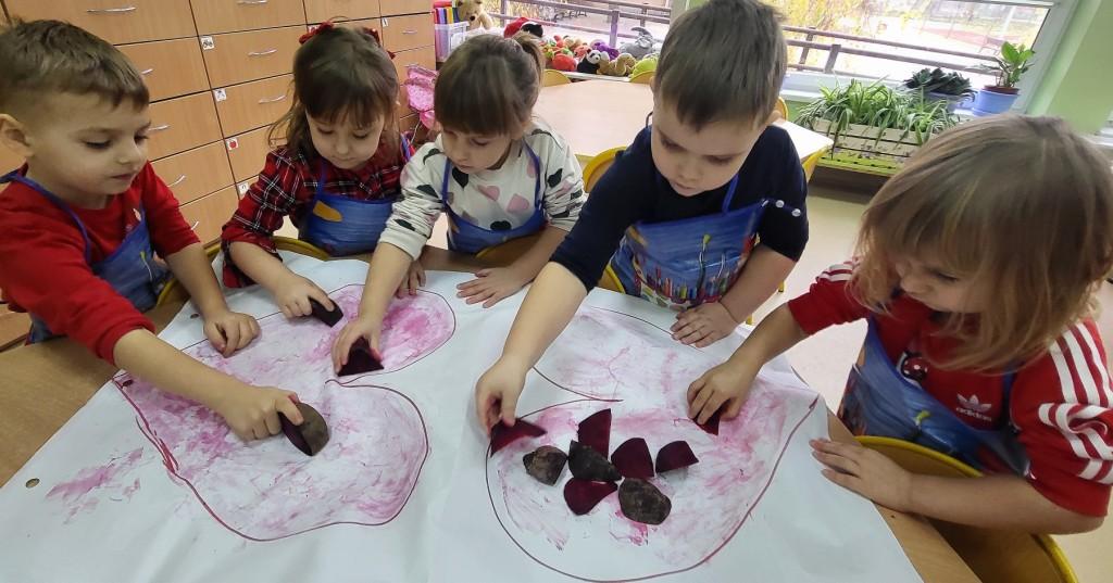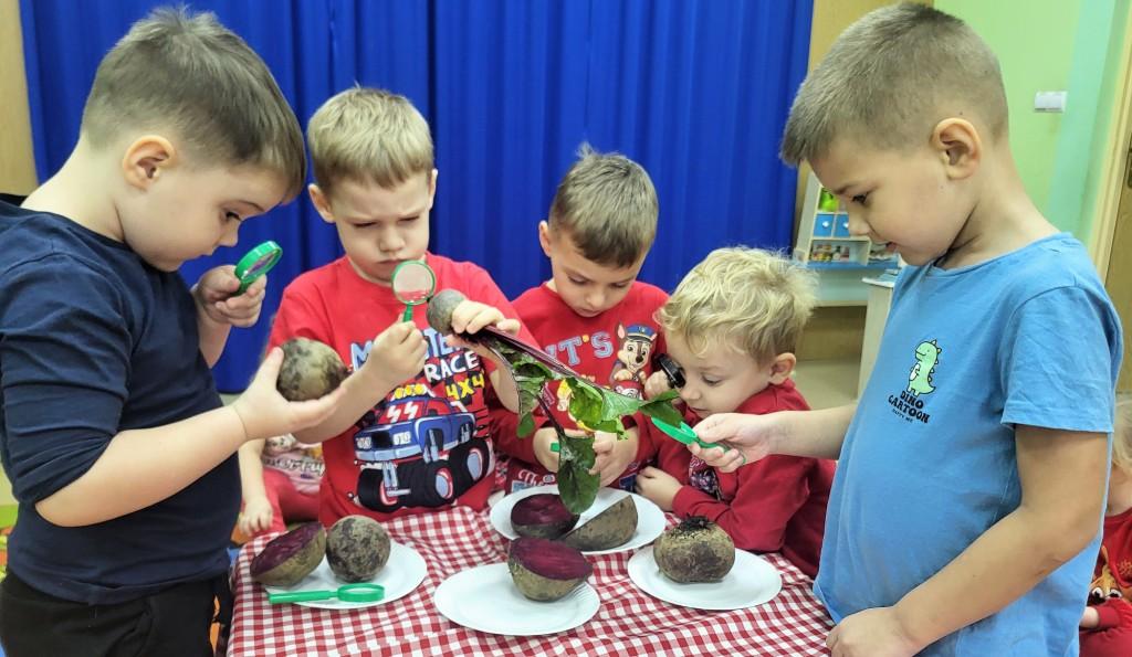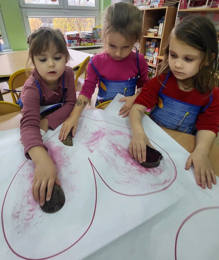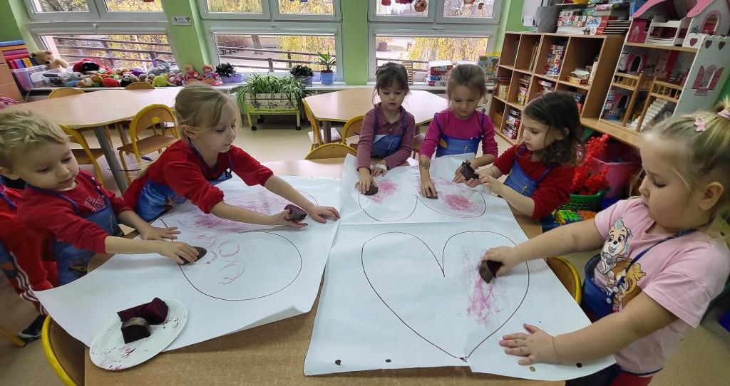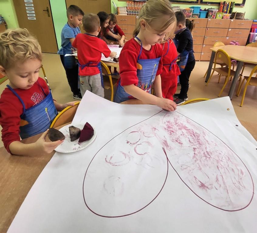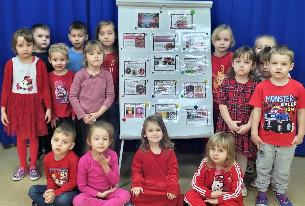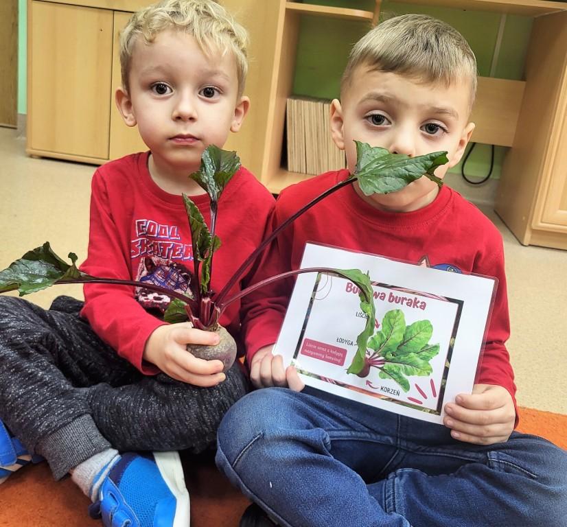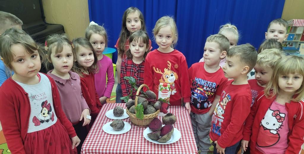 20 listopada przedszkolaki z grupy Motylki obchodziły Dzień Buraka.Dowiedziały się jak bardzo jest zdrowy,jakie zawiera witaminy i wartości odżywcze.Poznały jego różne gatunki,m.in.buraka cukrowego czy pastewnego.Dzień Buraka obfitował w warzywne zagadki,piosenki i prace plastyczne z ciemnoczerwonym warzywem w roli głównej.Dzieci na własnych paluszkach zobaczyły buraczany kolor,wykorzystały kreatywnie buraka malując serduszka,poznały różne przetwory z buraka, wysłuchały wiersza J.Brzechwy-Na straganie oraz spróbowały soku z buraka.Miały również okazję dowiedzieć się jak powstaje cukier z buraka cukrowego oglądając film edukacyjny pt.:Od buraka do lizaka.