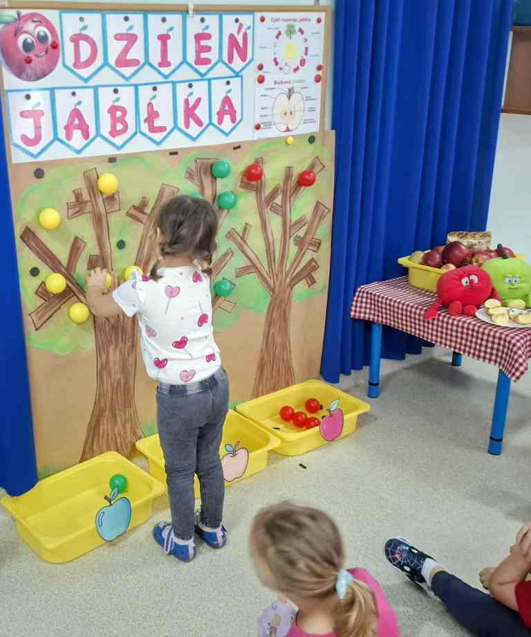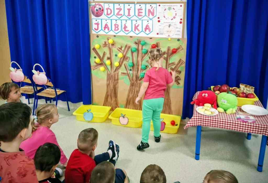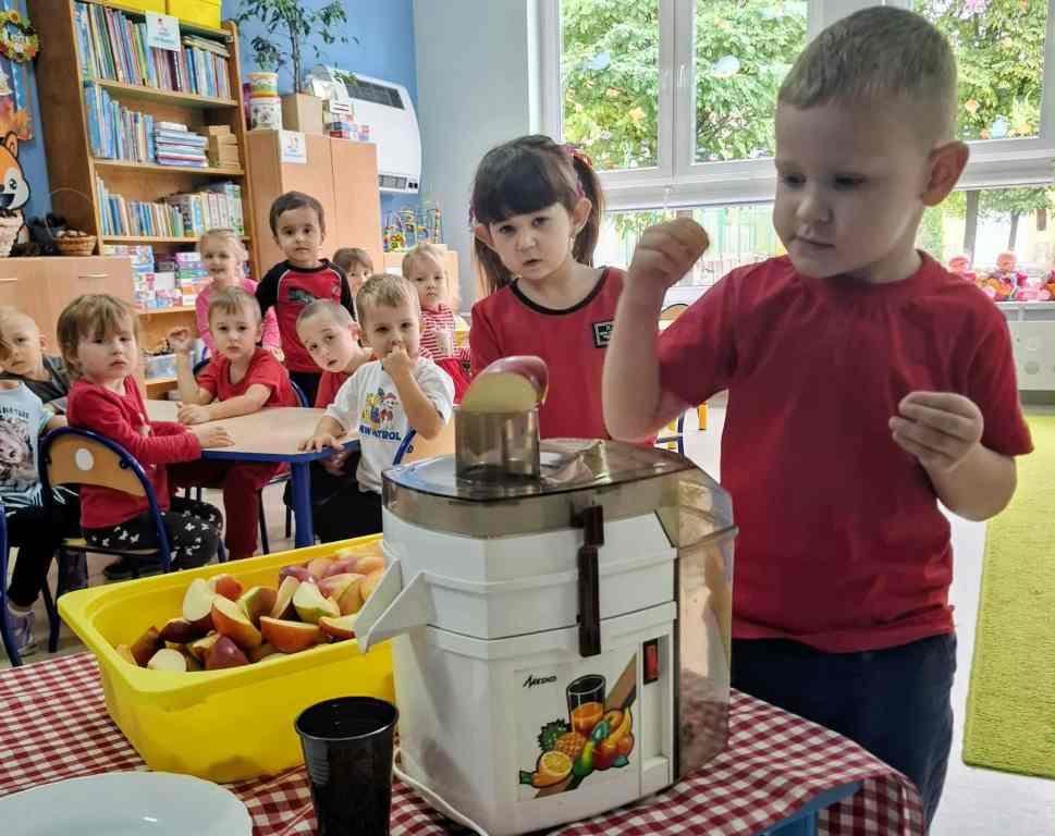 8 października dzieci z grupy Rybki obchodziły Dzień Jabłka.Dzieci miały okazję poznać budowę jabłka oraz dowiedzieć się,dlaczego warto je jeść.Przedszkolaki wspólnie odkrywały, co można z jabłek przygotować–od pysznych musów i szarlotek po orzeźwiający sok.Najwięcej radości sprawiło dzieciom robienie własnego soku jabłkowego–wszyscy z zaangażowaniem obserwowali,jak z chrupiących jabłek powstaje pyszny napój.Nie zabrakło też zabaw edukacyjnych.Przedszkolaki klasyfikowały jabłka według koloru,rozwijając przy tym spostrzegawczość i umiejętność współpracy,a także rozwijały sprawność manualną urządzając wyścigi w szybkim zbieraniu jabłek do koszyczka.Dzień Jabłka był doskonałą okazją do nauki przez zabawę.Dzieci wzbogaciły swoją wiedzę,rozwijały zmysły i przekonały się,że zdrowe przekąski mogą być naprawdę pyszne.