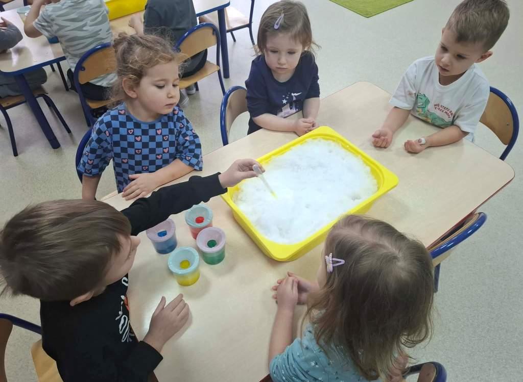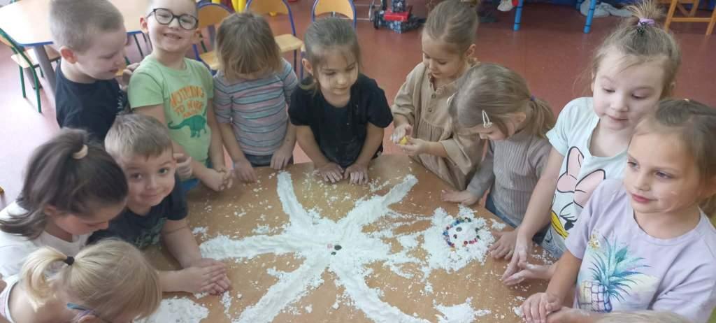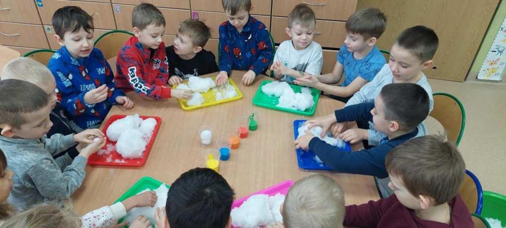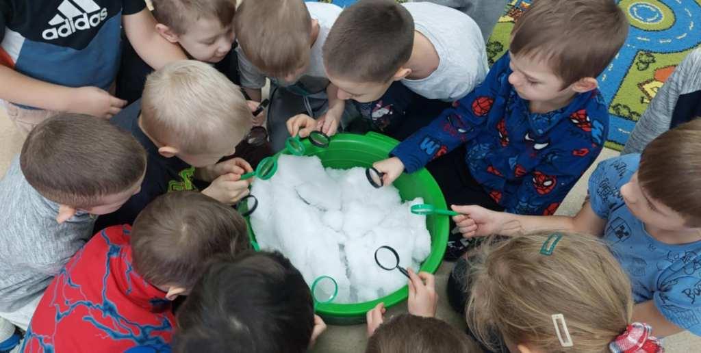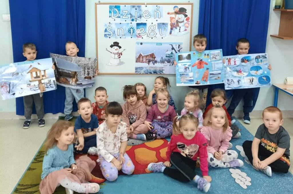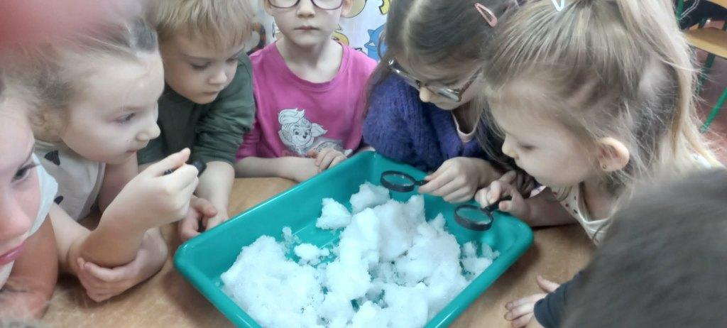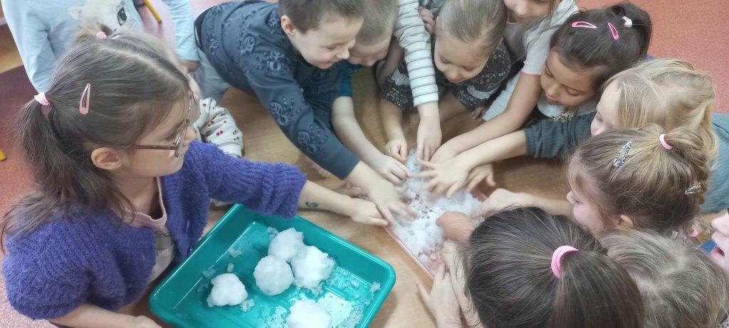 W naszym przedszkolu odbył się Dzień Śniegu,podczas którego dzieci z poszczególnych grup uczestniczyły w różnorodnych aktywnościach dostosowanych do ich wieku.Przedszkolaki poznawały właściwości śniegu i lodu–obserwowały jego wygląd,temperaturę oraz zmiany pod wpływem ciepła.Brały udział w zabawach badawczych,tworzyły sztuczny śnieg,a także eksperymentowały z lodem,sprawdzając,jak topnieje i zmienia swoją postać.Nie zabrakło również zimowych zabaw ruchowych oraz innych działań inspirowanych zimą.Dzień ten był pełen radości,ciekawych doświadczeń i rozwijania dziecięcej ciekawości świata.