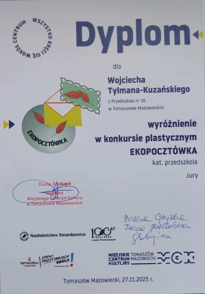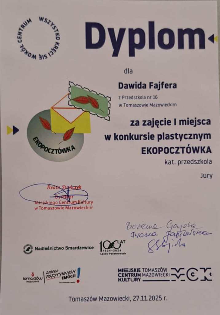 27 listopada w MCK odbyło się podsumowanie konkursu Ekopocztówka.Dzieci z grupy Żabki zdobyły następujące miejsca: