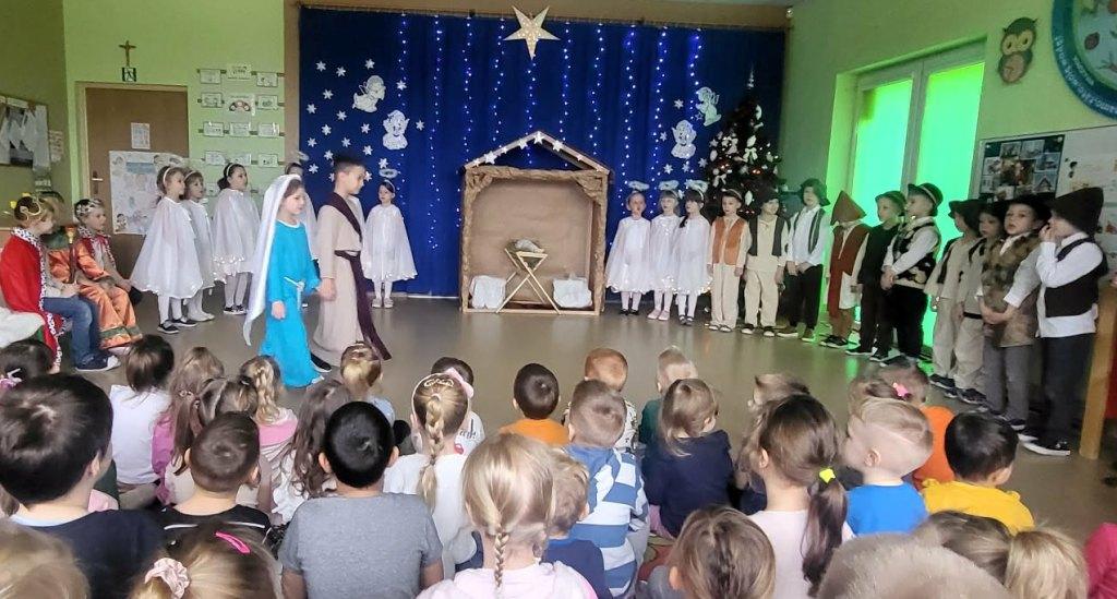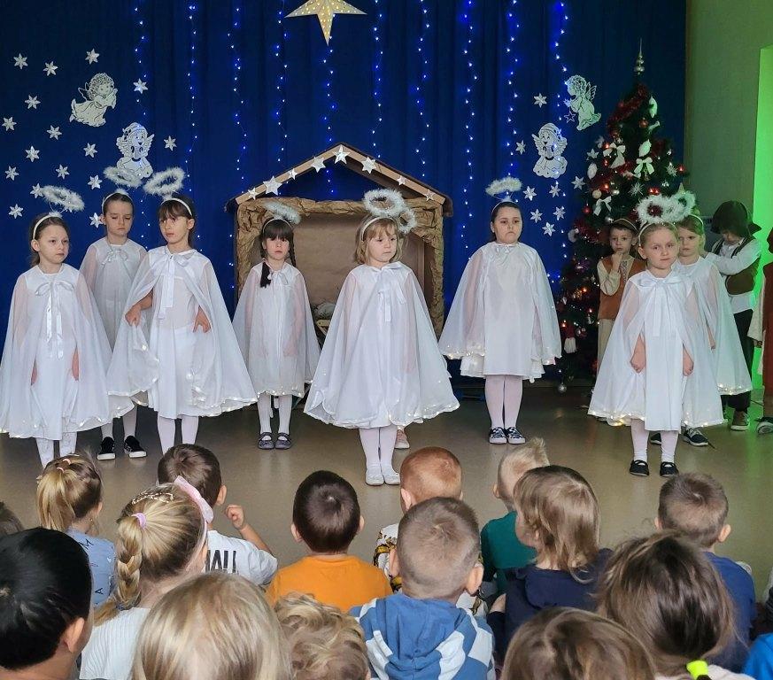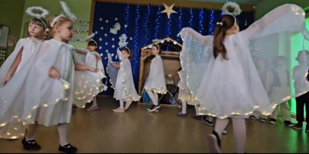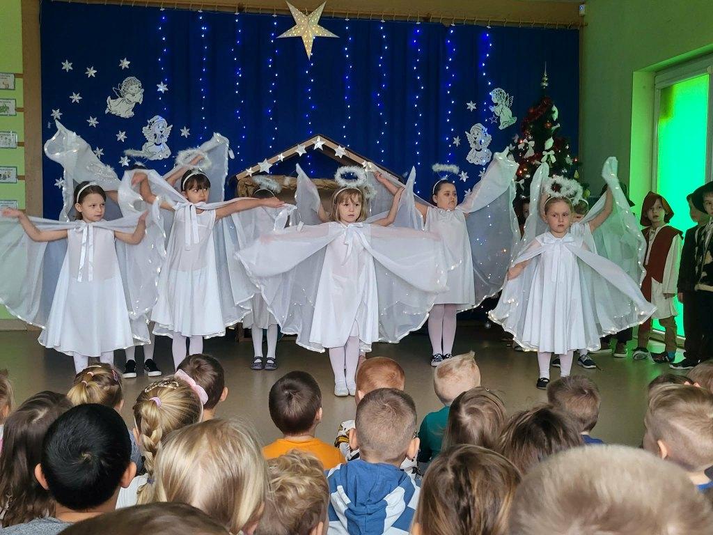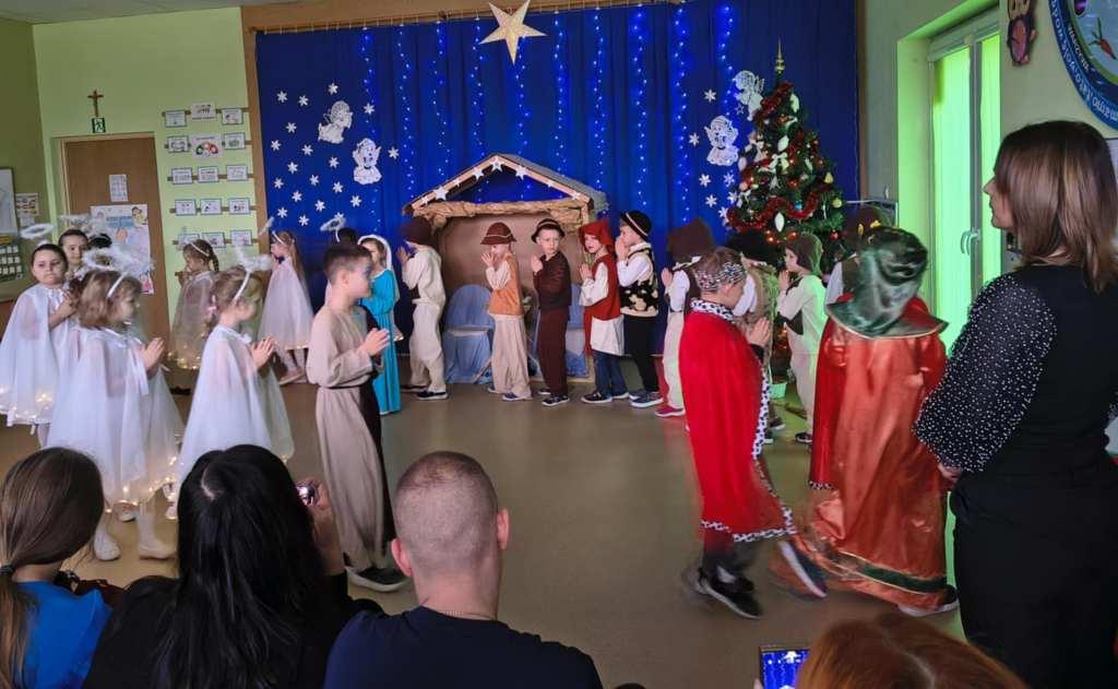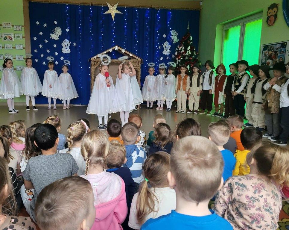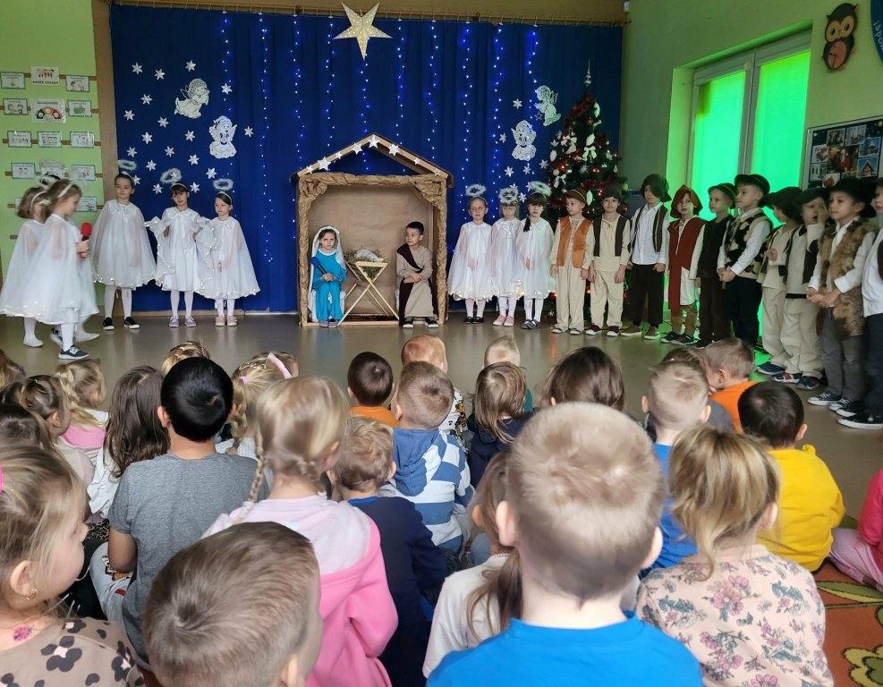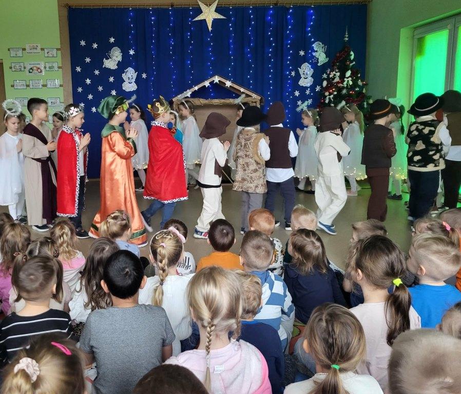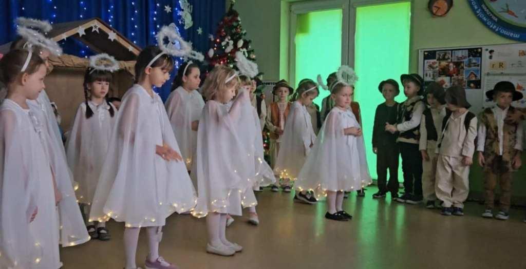 Okres świąt Bożego Narodzenia to czas pełen radości,piękna i refleksji.Czas spełniania marzeń i okazywania sobie wzajemnej miłości,a przede wszystkim spotkań w gronie najbliższych.Aby podkreślić wyjątkowy charakter tych świąt,Żabki przygotowały przedstawienie jasełkowe,które wprowadziło wszystkich zaproszonych Gości w ten piękny nastrój.Dzieci w specjalnie przygotowanych przez Rodziców strojach oraz w scenografii nawiązującej do Betlejem przedstawiły sceny narodzin Jezusa Chrystusa.Przedszkolaki z dużym przejęciem i zaangażowaniem wiernie odtwarzały swoje role,prezentowały umiejętności recytatorskie i wokalne oraz taneczne.Takie podniosłe chwile nie tylko utrwalają dzieciom znajomość tradycji i zwyczajów świątecznych,lecz wzmacniają serdeczne relacje między nimi.Po występie odbyły się warsztaty wspólnego robienia stroików świątecznych.To był magiczny czas.Życzymy Wszystkim Wesołych Świąt.