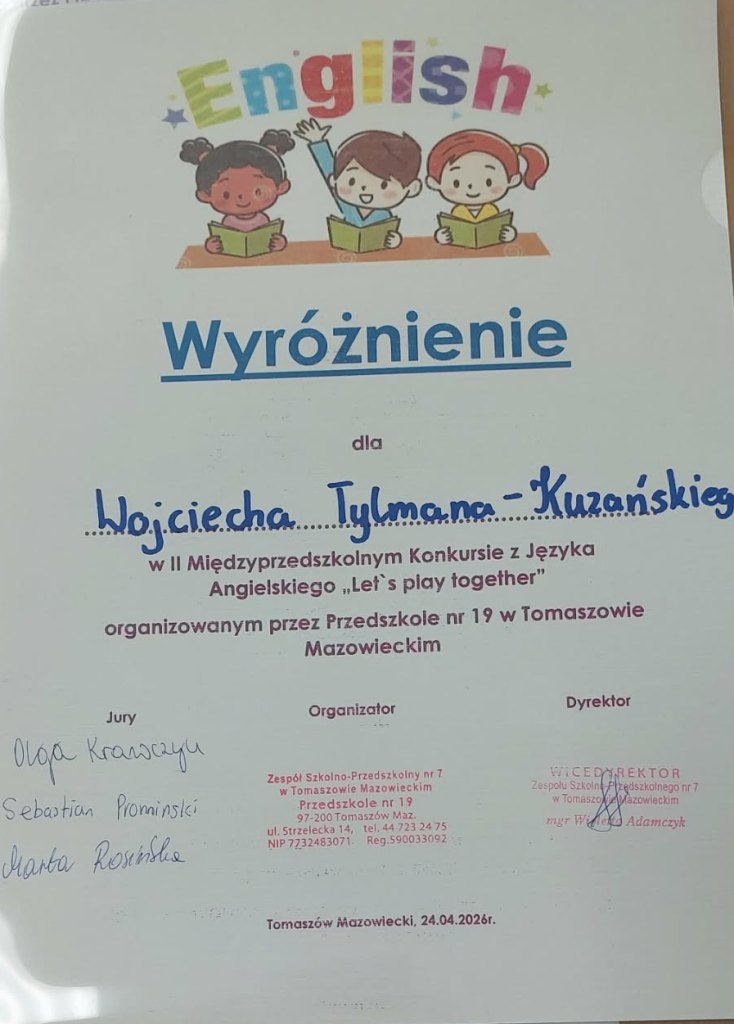 24 kwietnia został rozstrzygnięty konkurs z Języka angielskiego.Wyróżnienie zdobył Wojciech Tylman-Kuzański z grupy Żabki.Serdecznie gratulujemy.