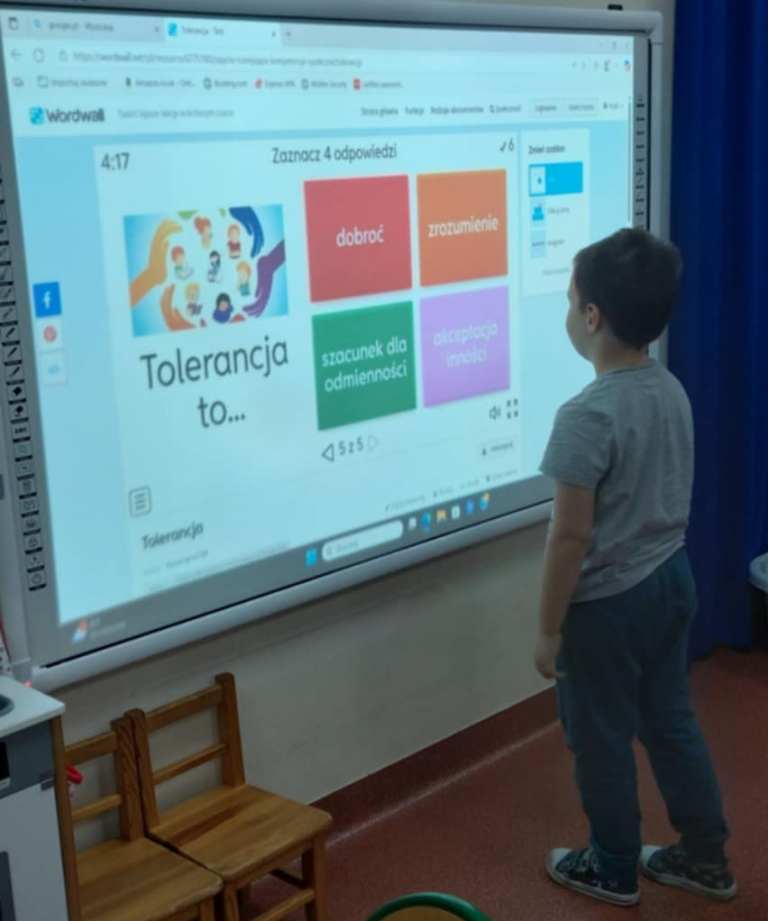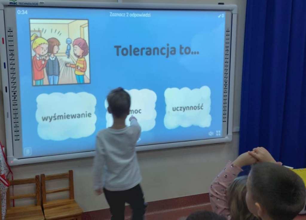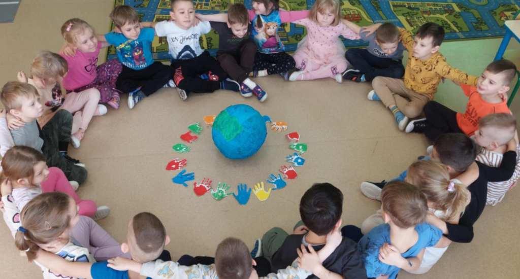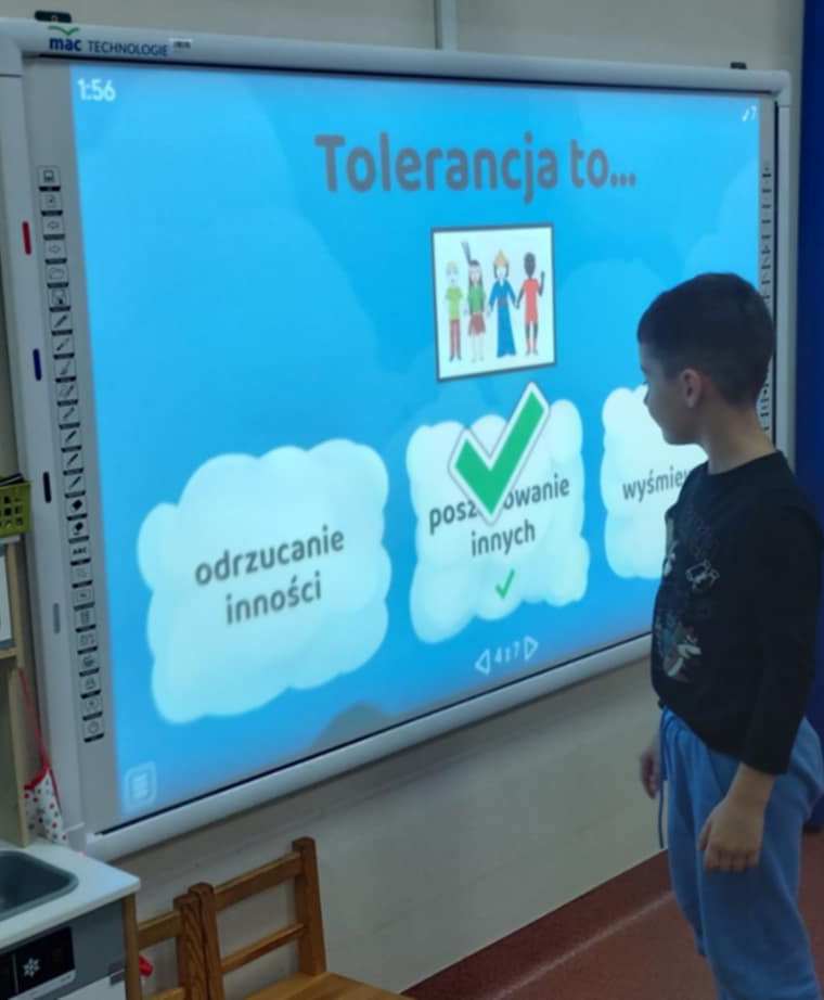 14 listopada Przedszkolaki świętowały Międzynarodowy Dzień Tolerancji.W grupach zostały przeprowadzone zajęcia, podczas których dzieci uczyły się prawidłowych postaw społecznych, akceptowania odmienności innych ludzi,poszanowania cudzej godności oraz uczuć.Dzieci obejrzały film edukacyjny pt.Jesteśmy różni,jesteśmy równi po którym próbowały odpowiedzieć na pytanie-Co to jest tolerancja?,wykonywały zadania na tablicy interaktywnej wskazywały słowa opisujące tolerancję.Następnie brały udział w zabawie integracyjnej-Nasza grupa,w której uczestnicy zabawy podają sobie kłębek i mówią w czym są do siebie podobni,a czym się różnią.Na koniec malowały swoje dłonie farbami i ułożyły je wokół Ziemi tworząc krąg Tolerancji i Życzliwości.