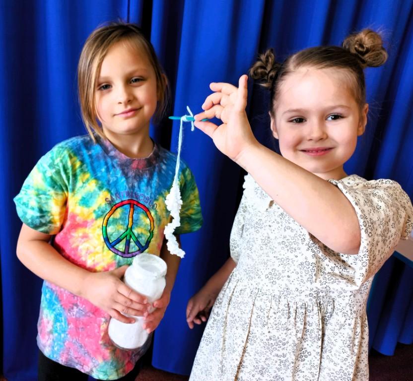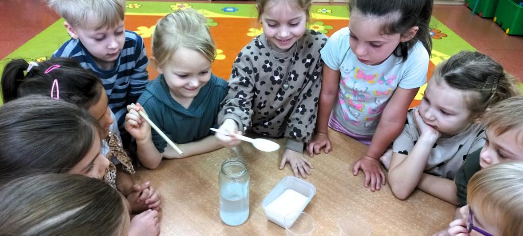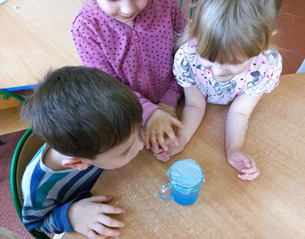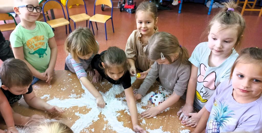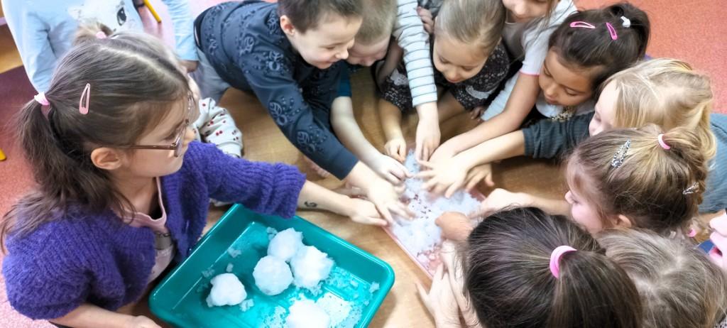 - dowiedziały się skąd się bierze śnieg i poznały jego właściwości,wykonały śniegowe eksperymenty,stworzyły sztuczny śnieg z mąki ziemniaczanej