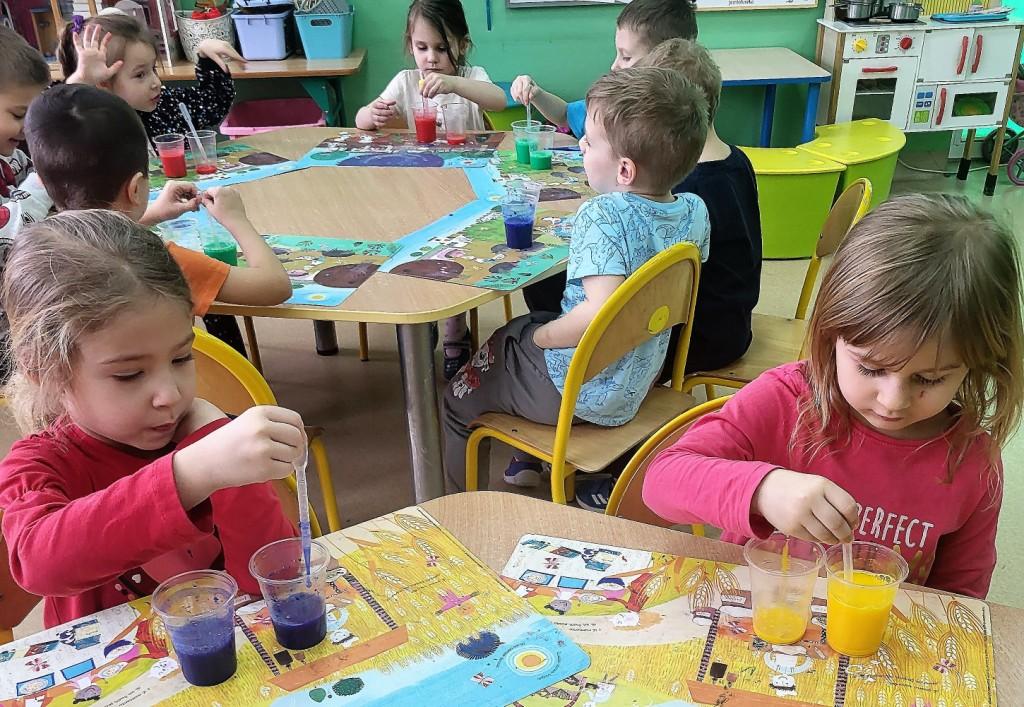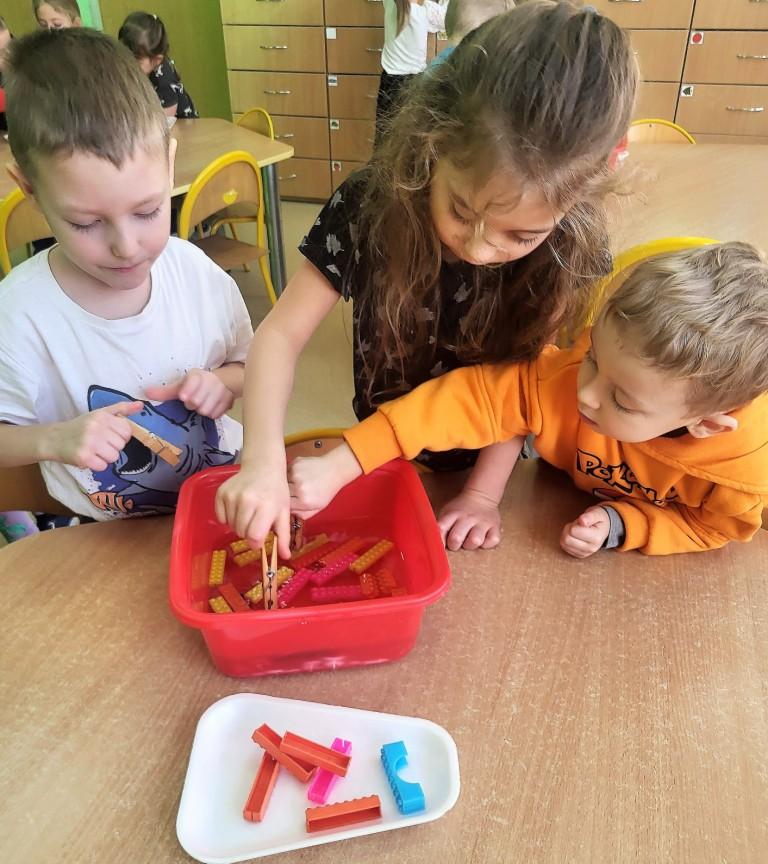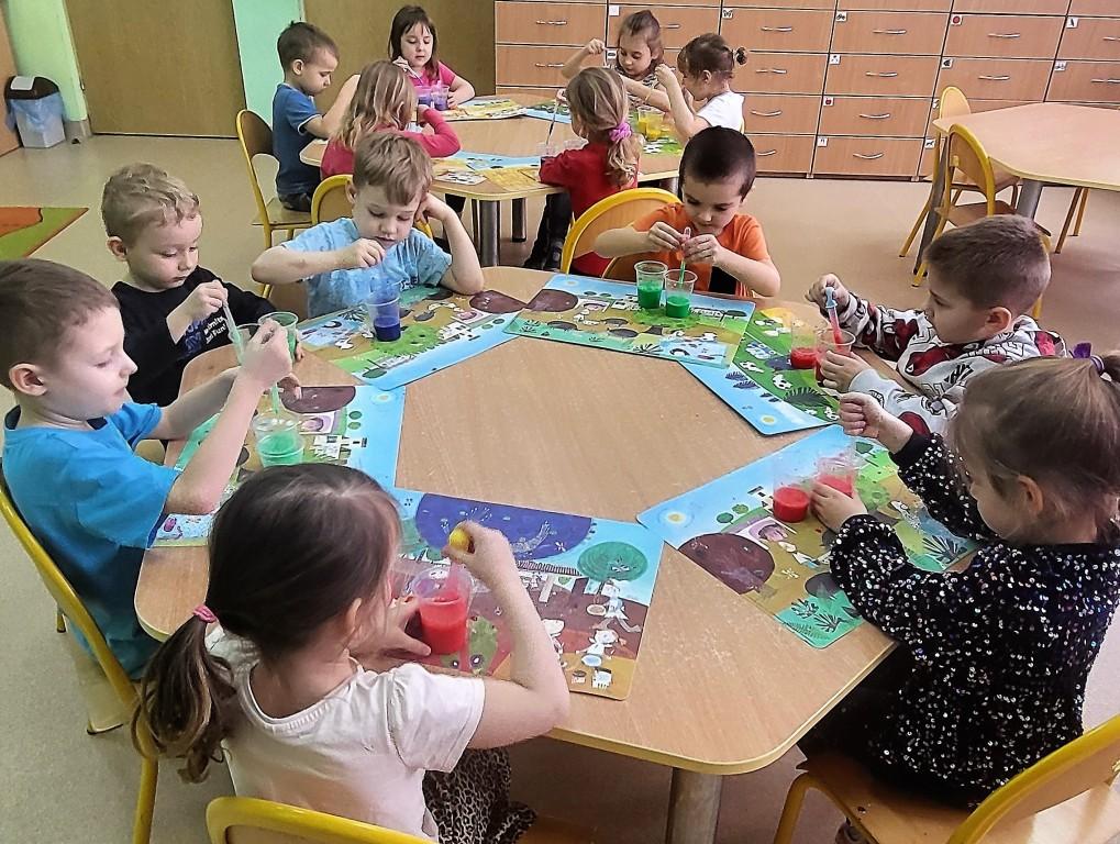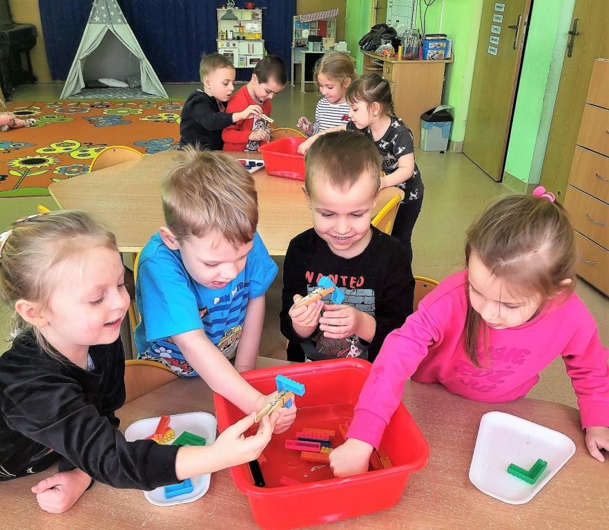 Dzieci z grupy Motylki realizują projekt edukacyjny-Małe rączki–wielkie możliwości,czyli sensoryczna droga do sprawności,który ma na celu rozwijanie sprawności manualnej dzieci poprzez radosne,zmysłowe działanie.Przedszkolaki nie tylko rozwijają motorykę małą,ale również uczą się samodzielności i budują wiarę w swoje możliwości.Kreatywne zabawy sensoryczne angażują dłonie,palce,zmysły i przede wszystkim dziecięcą wyobraźnię.Tym razem przedszkolaki nawlekały kawałki słomek na sznurek tworząc trąbę słonia,łowiły plastikowe nakrętki z miski napełnionej wodą za pomocą klamerek do bielizny,przelewały kolorową wodę z kubeczka do kubeczka za pomocą pipet,malowały farbą z użyciem patyczków higienicznych oraz prowadziły kroplę wody po wyznaczonym torze przy użyciu wykałaczki.