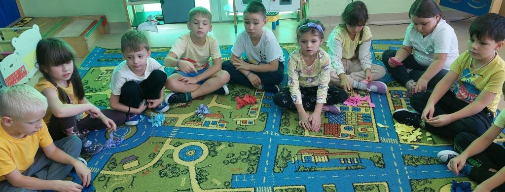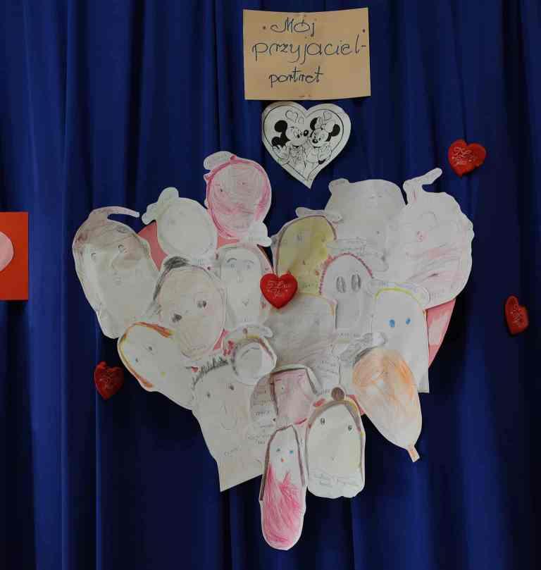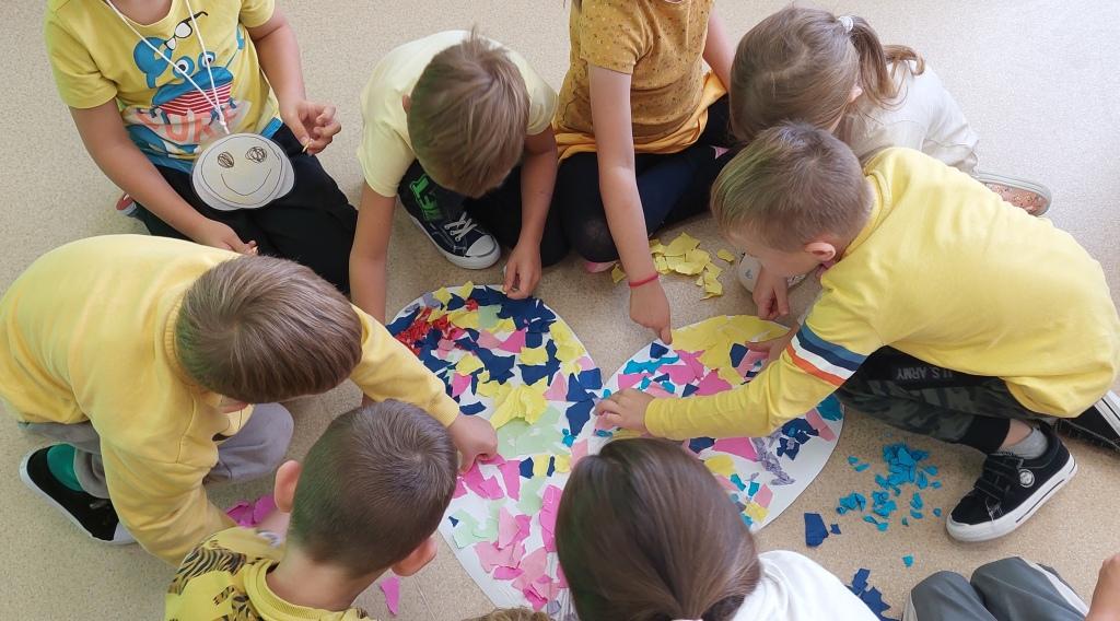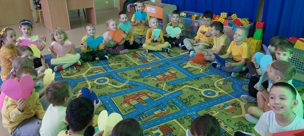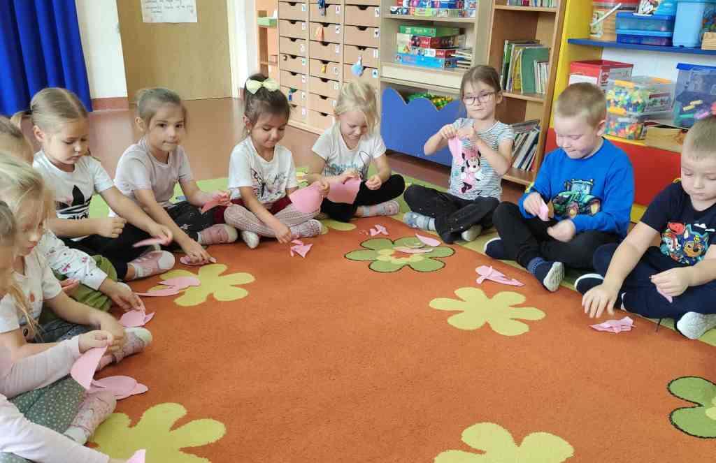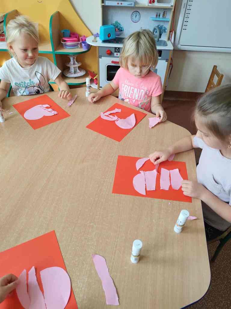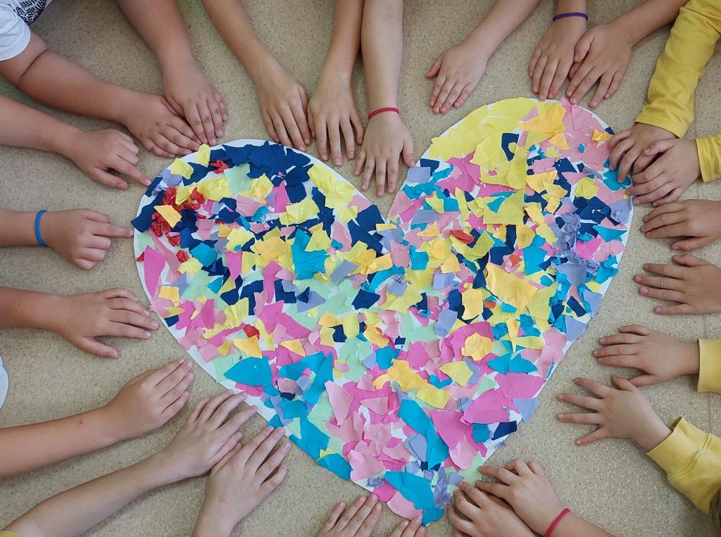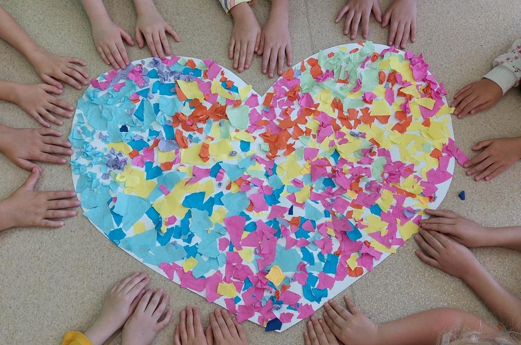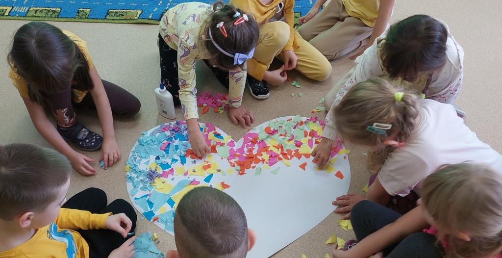W dniu dzisiejszym Przedszkolaki z grupy Żabki i Wiewiórki rozmawiały o sprawach ważnych dla każdego człowieka-o tym,jak się czujemy,co może Nas skrzywdzić oraz jak my sami wpływamy na innych swoim zachowaniem.Najpierw wysłuchały opowiadania Serduszko z listków i rozmawiały na jego temat.Następnie otrzymały serduszka, które rozdzierały, mówiąc o tym, jakie słowa lub zachowanie są dla nich przykre i bolesne, czego się boją.Potem wypowiadały się na temat co sprawia,że czują się dobrze i co możemy zrobić aby naprawić zranione serce.Na koniec wykonały pracę plastyczną,przyklejając na duże serce porozrywane kawałki serc zranionych tworząc radosne serce całej grupy.