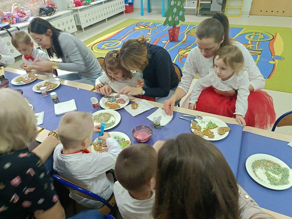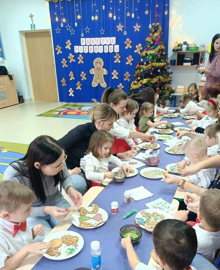 W grupie Rybki odbyły się wyjątkowe warsztaty świąteczne z udziałem rodziców.W ciepłej,radosnej atmosferze dzieci wraz z bliskimi dekorowały pierniczki,rozwijając swoją kreatywność i ciesząc się wspólnie spędzonym czasem.Nie zabrakło również wspólnego kolędowania oraz wesołych zabaw przy świątecznych piosenkach,które wprowadziły wszystkich w magiczny,Bożonarodzeniowy nastrój.Dziękujemy rodzicom za obecność i zaangażowanie–to był piękny czas pełen uśmiechów i świątecznej radości.