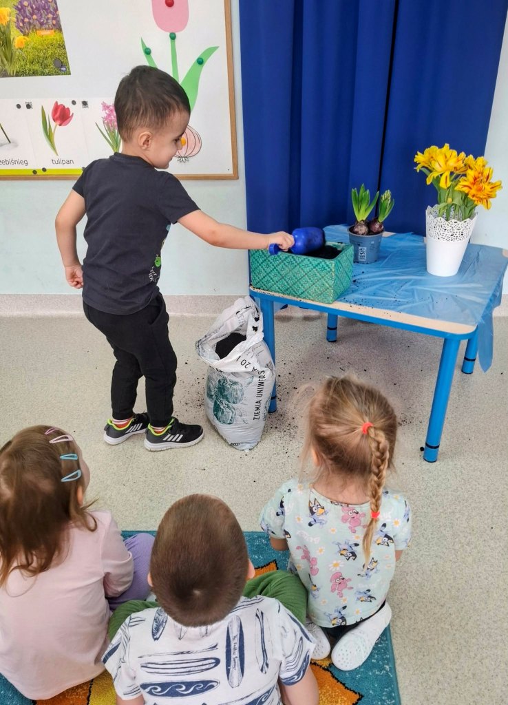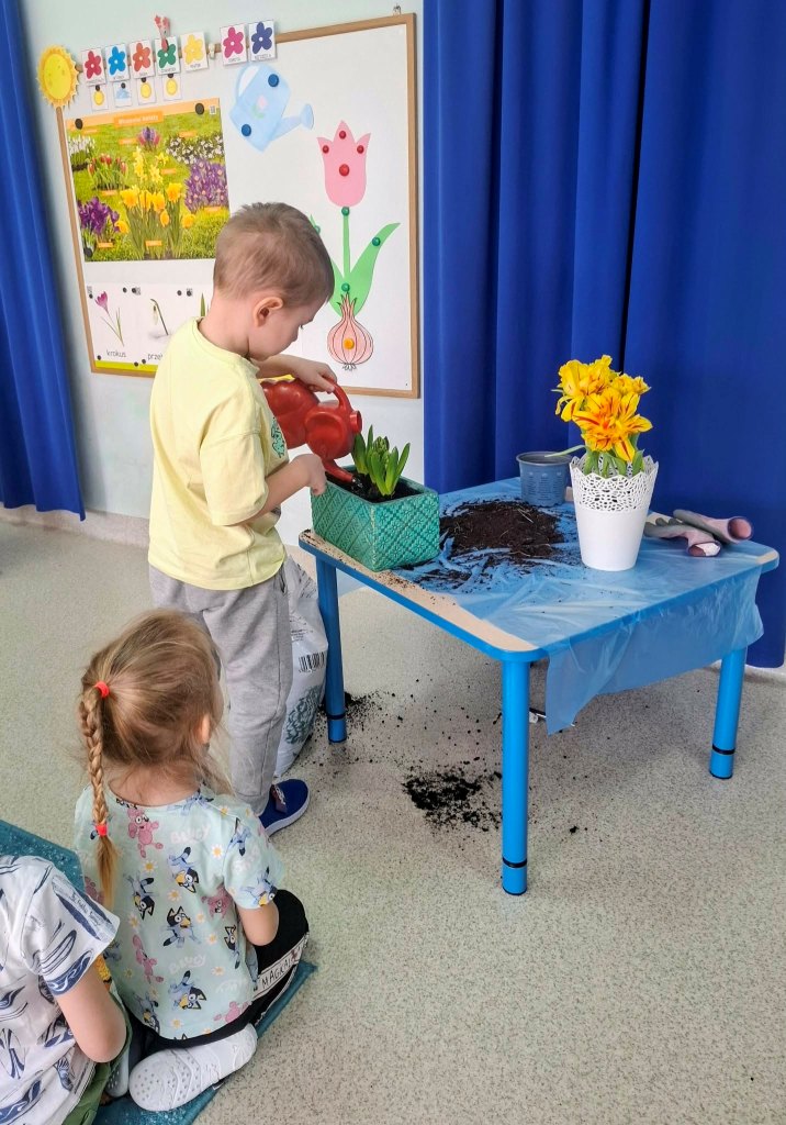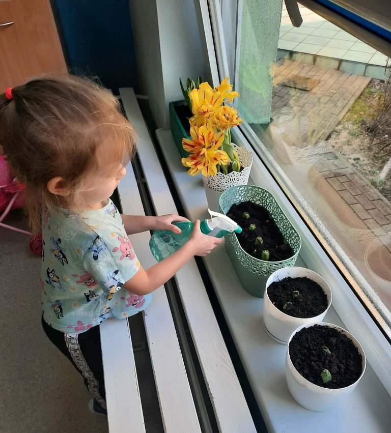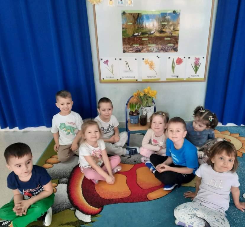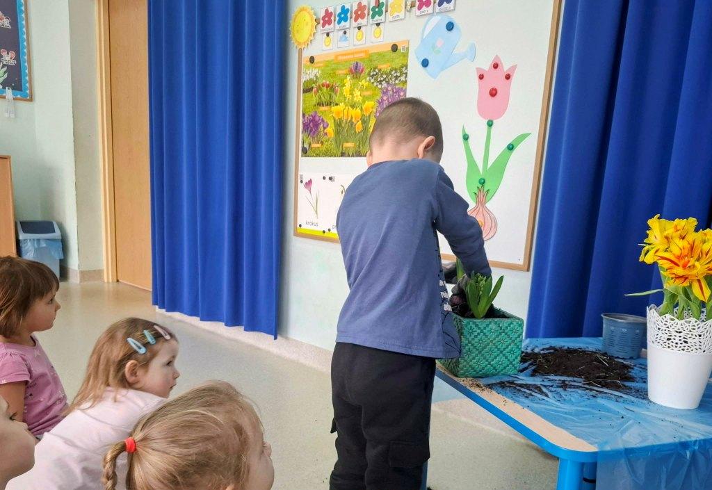 Wiosna to doskonała pora roku,by rozbudzać zainteresowanie dzieci zmianami zachodzącymi w przyrodzie(pojawianie się pierwszych kwiatów,przyloty ptaków,budzenie się zwierząt z zimowego snu,itp.).Stwarza także sprzyjające okoliczności do prowadzenia obserwacji zmian pogodowych i poznawania cyklu rozwojowego roślin oraz warunków potrzebnych im do wzrostu.Dzieci z grupy Rybki podczas zajęć samodzielnie sadziły wiosenne kwiaty oraz cebulki na szczypior,spacerowały w pobliżu przedszkola szukając pierwszych kwiatów, wypatrując powracających ptaków i słuchając dźwięków wiosennej przyrody.Przedszkolaki wyrażały muzykę poprzez swobodną ekspresję ruchową,malowały muzykę paskami bibuły.Choć na chwilę można było przenieść się oczami wyobraźni w zaczarowany,baśniowy świat.Jakże inaczej można było przywitać Panią Wiosnę jeśli nie utworem Antonio Vivaldiego„Cztery pory roku–Wiosna”.
