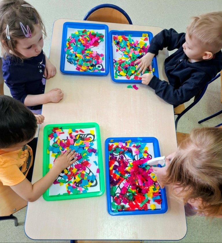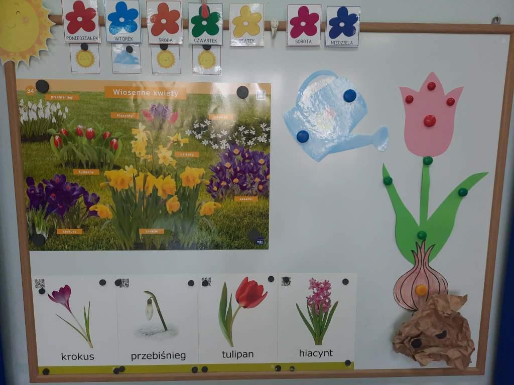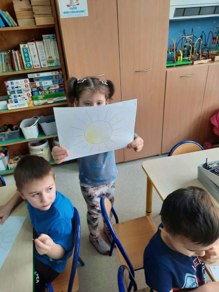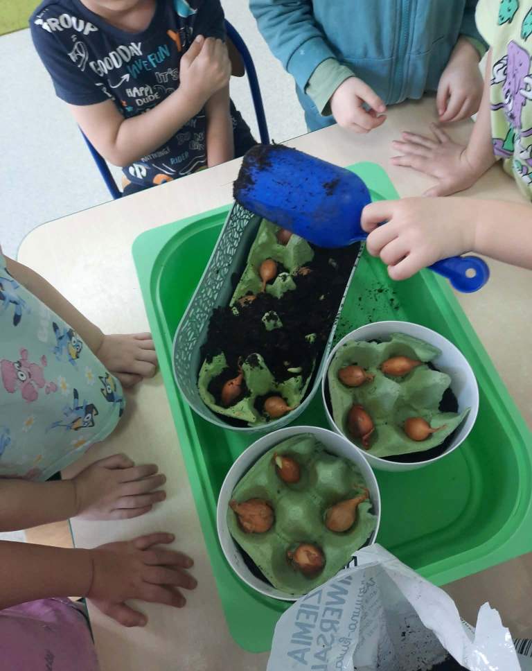 Wiosna to doskonała pora roku,by rozbudzać zainteresowanie dzieci zmianami zachodzącymi w przyrodzie(pojawianie się pierwszych kwiatów,przyloty ptaków,budzenie się zwierząt z zimowego snu,itp.).Stwarza także sprzyjające okoliczności do prowadzenia obserwacji zmian pogodowych i poznawania cyklu rozwojowego roślin oraz warunków potrzebnych im do wzrostu.Dzieci z grupy Rybki podczas zajęć samodzielnie sadziły wiosenne kwiaty oraz cebulki na szczypior,spacerowały w pobliżu przedszkola szukając pierwszych kwiatów, wypatrując powracających ptaków i słuchając dźwięków wiosennej przyrody.Przedszkolaki wyrażały muzykę poprzez swobodną ekspresję ruchową,malowały muzykę paskami bibuły.Choć na chwilę można było przenieść się oczami wyobraźni w zaczarowany,baśniowy świat.Jakże inaczej można było przywitać Panią Wiosnę jeśli nie utworem Antonio Vivaldiego„Cztery pory roku–Wiosna”.