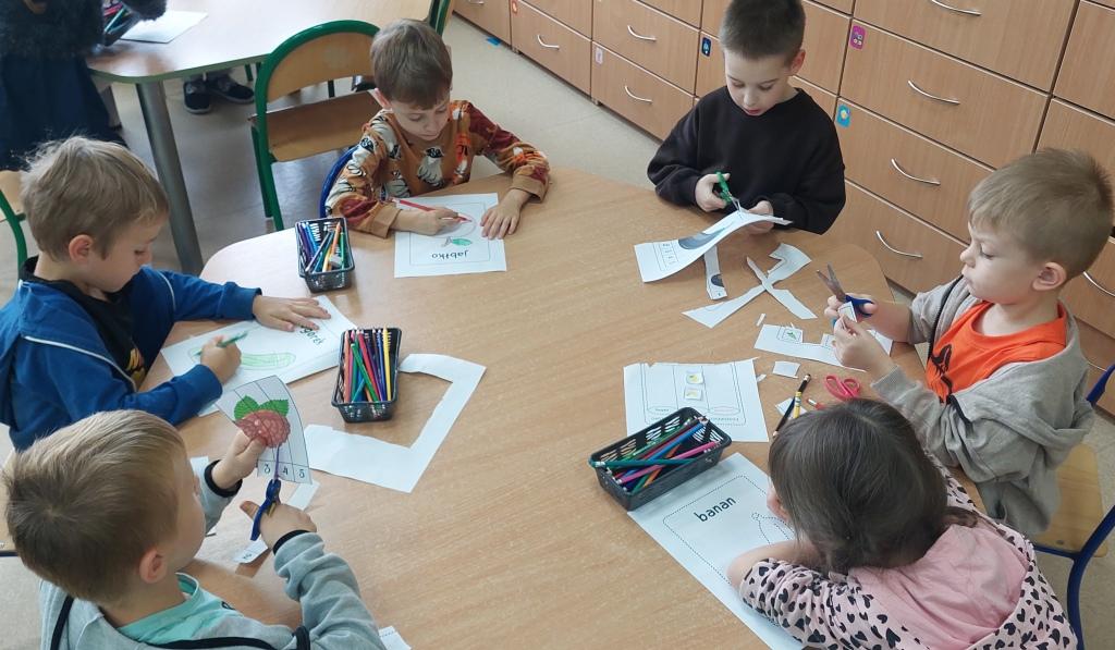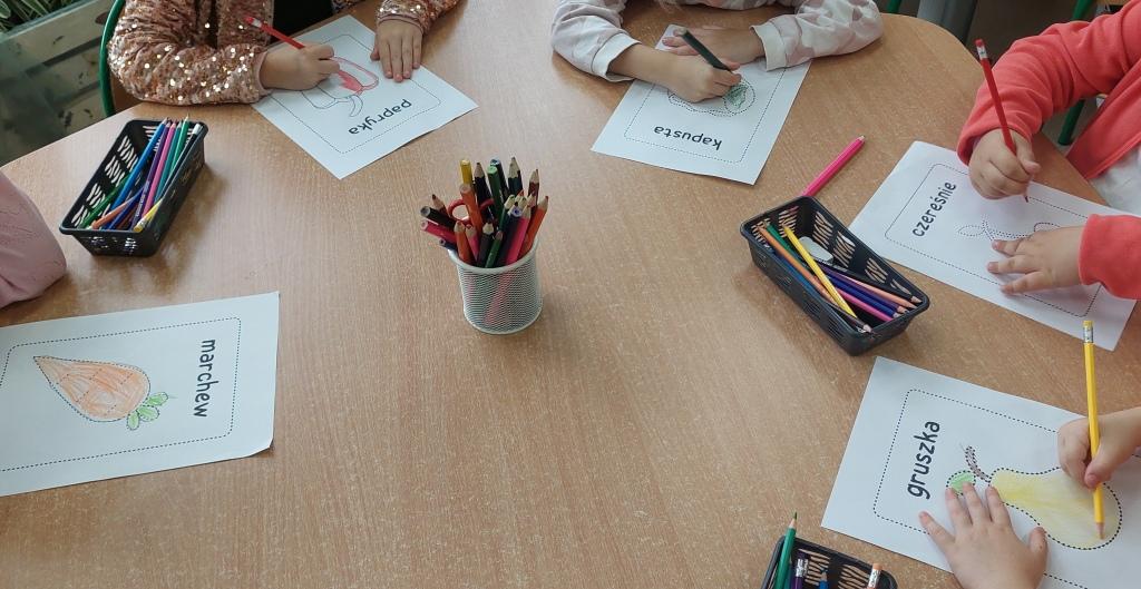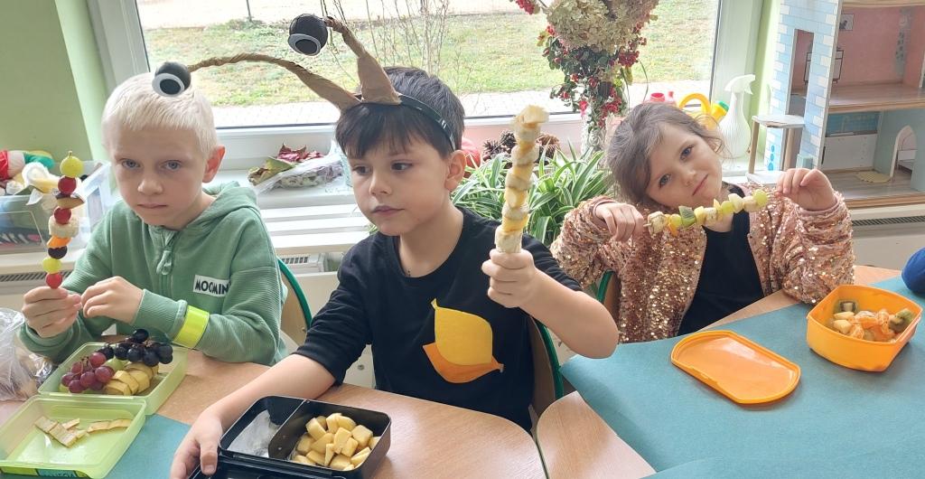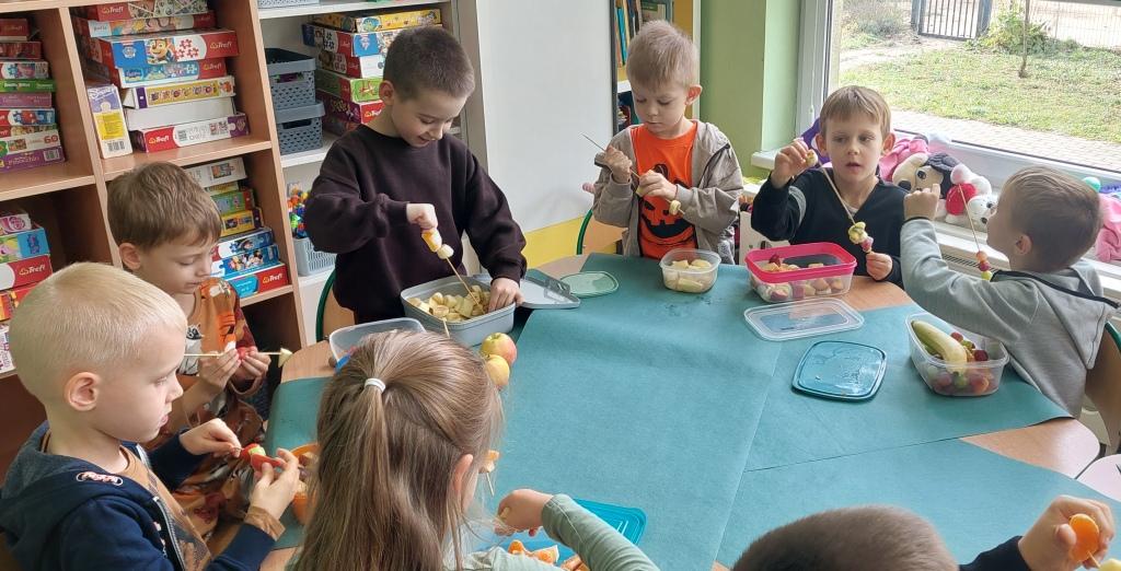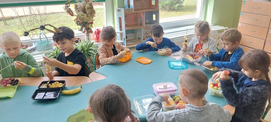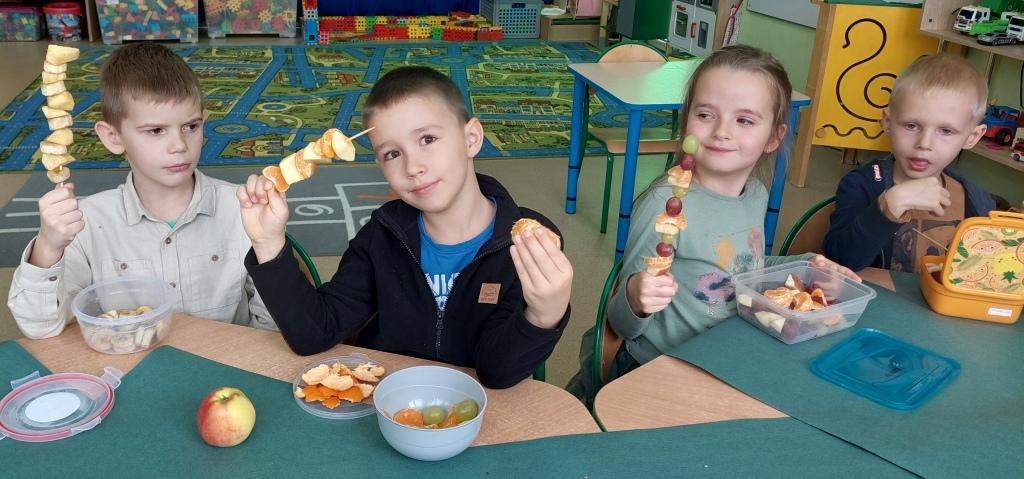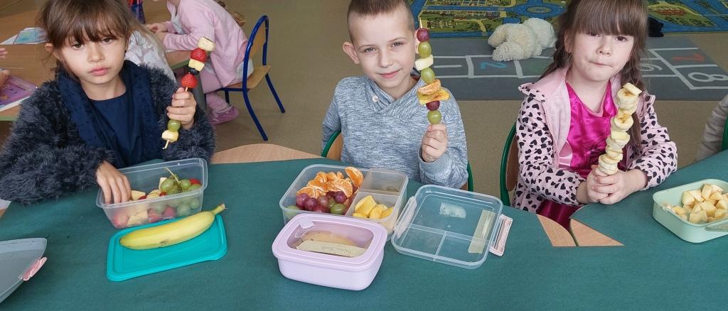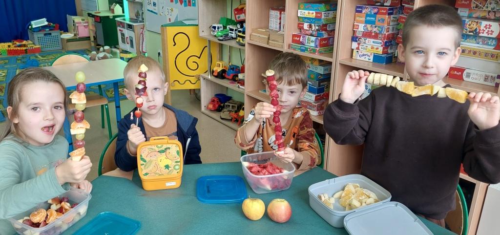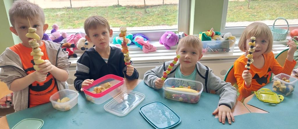 Żabki przystąpiły do realizacji Ogólnopolskiego projektu edukacyjnego-Zdrowe życie, pierwsza pomoc przedszkolaka.W ramach I modułu poznawały znaczenie owoców i warzyw dla zdrowia,rozpoznawały i nazywały owoce i warzywa,określały ich kształt,wielkość oraz kolor.Na koniec po umyciu rąk i wysłuchaniu zasad bezpieczeństwa samodzielnie wykonały pyszne owocowe szaszłyki, które następnie degustowały.Zrealizowane działania edukacyjne miały na celu rozwijanie nawyków zdrowego żywienia oraz zrozumienie znaczenia owoców i warzyw dla zachowania zdrowia.Na koniec układały warzyno-owocowe puzzle, kolorowały warzywa i owoce.